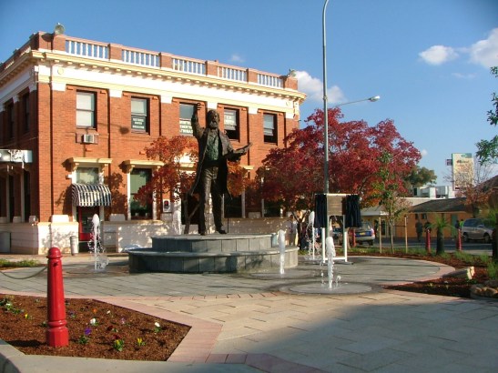 Chamberlain Square and Sir Henry Parkes statue with water features. Photograph by Parkes Shire Council May 12th 2008