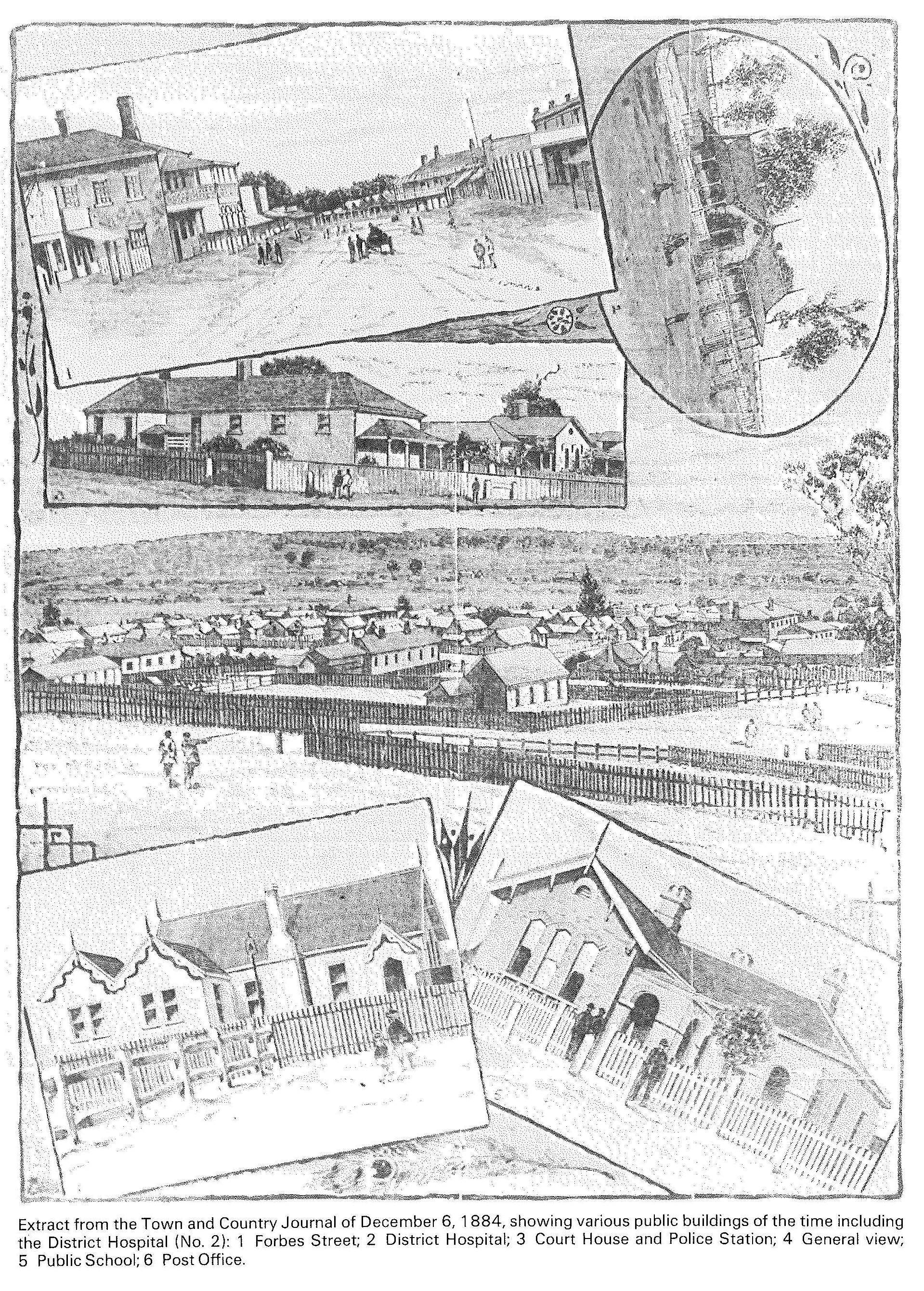 At McGuigans in 1874 among the businesses in the main street were those of chemists A. Baker, I.R. Raymond and J.W. Towle. It would have to be assumed that bark structures or tents served as hospital facilities. Source: Parkes: 100 Years of Local Government by Ron Tindall (editor) (1983) Griffin Press Limited: Netley, South Australia, page 163
