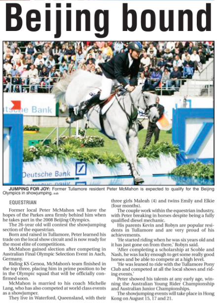 With the upcoming Summer Olympic Games in Rio de Janeiro, the Parkes Library history blog will focus on Olympians from the Parkes Shire. Each post will provide a snapshot of the sportsmen and sportswomen who have worn the green and gold and called the Parkes Shire home at some point of their lives. This post will focus on Peter McMahon, the Parkes Shire’s first equestrian Olympian who represented Australia at 2008 Beijing Olympic Games.
