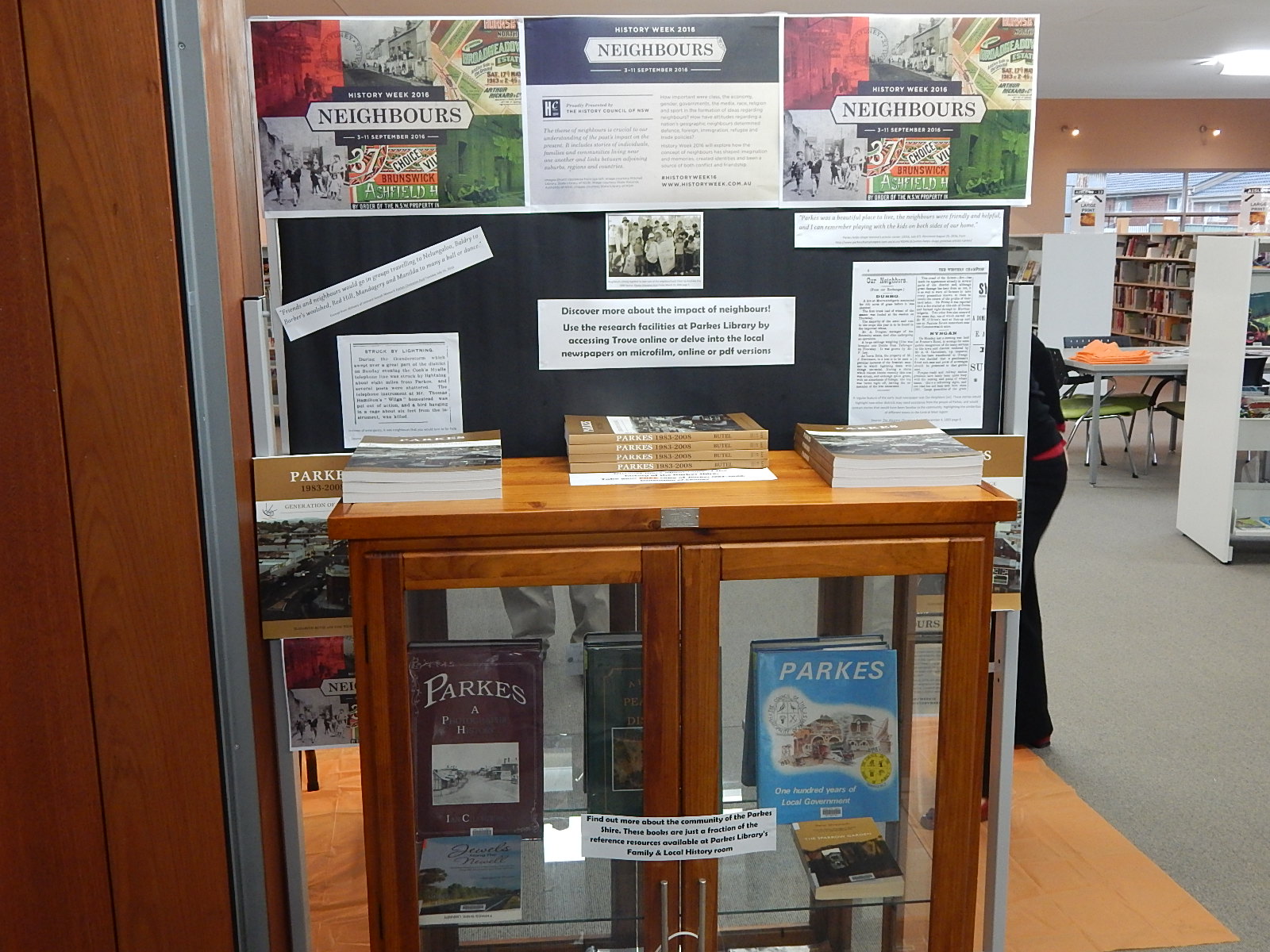 Photograph of the front side of Parkes Library's History Week display. The theme this year is Neighbours. Photograph by Dan Fredericks (Parkes Shire Library) taken September 2, 2016