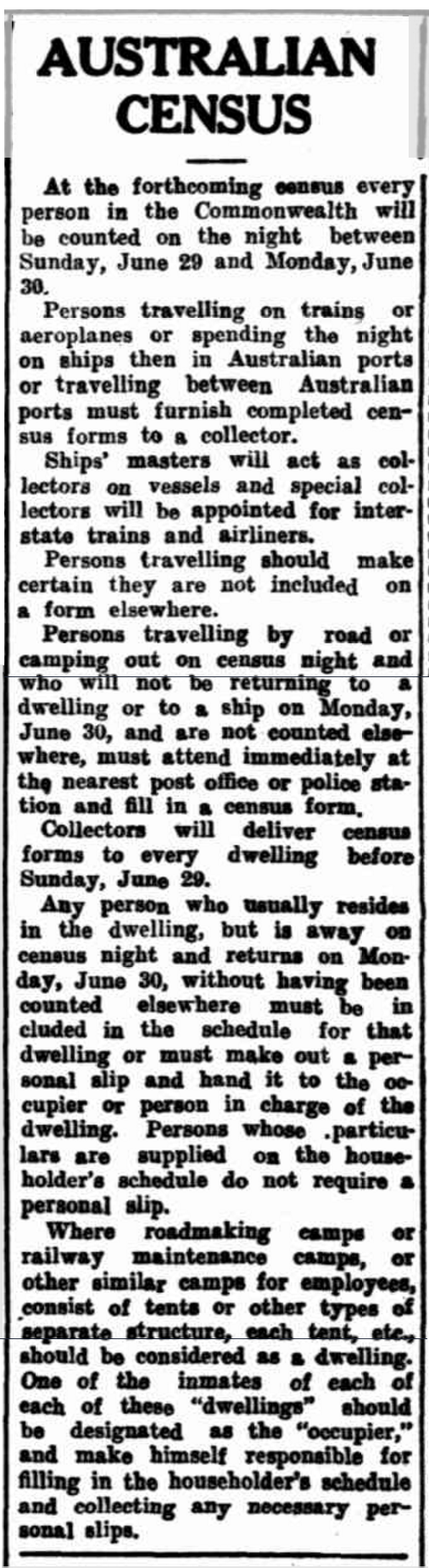 Newspaper report about the upcoming census on 30th June 1947. Instructions are included for those travelling interstate on trains and by ship. Source: Morning Bulletin (Rockhampton, Qld. : 1878 – 1954)