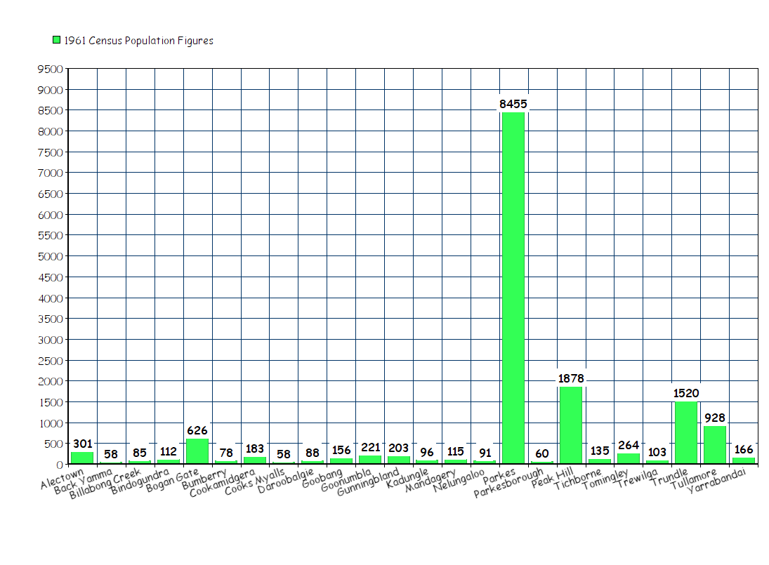 The populations figures of the various towns and villages in the Parkes Shire. Source 1961 Census Chart made using Online Chart Tool