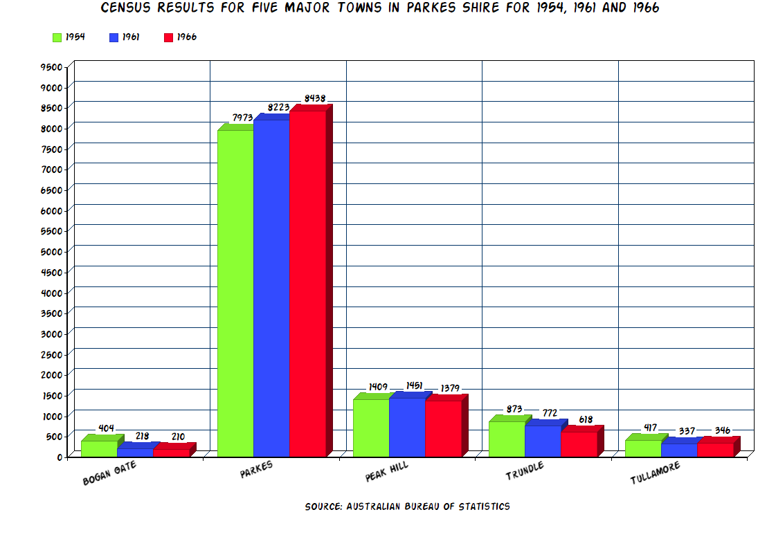 The populations figures of the various towns and villages in the are now known as the Parkes Shire. Source 1954 Census Chart made using Online Chart Tool