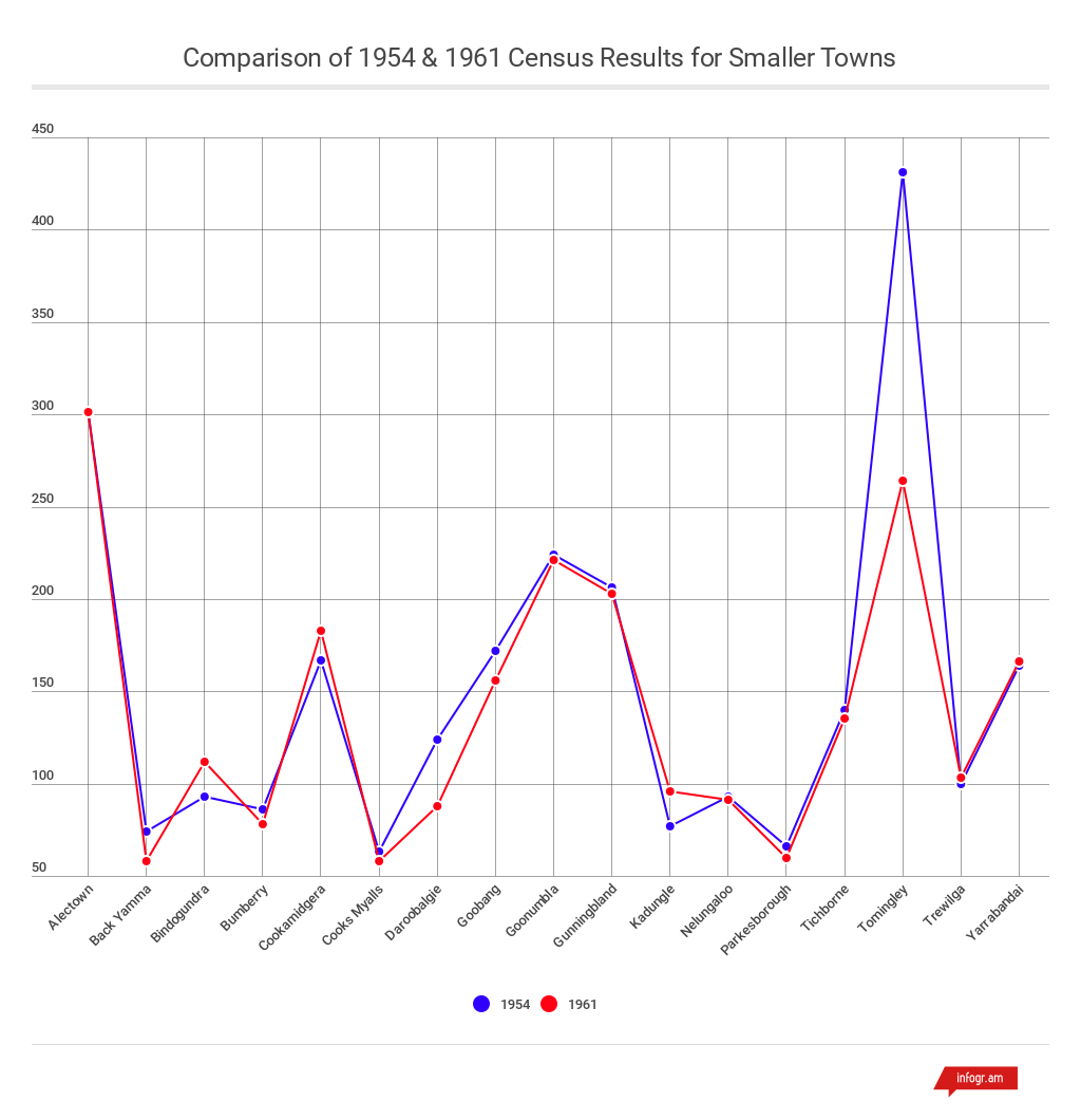 Table comparing the census results of the smaller towns within the area now known as the Parkes Shire. 1954 results are in blue and 1961 results are in red. While some smaller towns, such as Bindogundra and Cookamidgera grew, the majority of towns reduced in size between 1954 and 1961, especially Tomingley. Source: Australian Bureau of Statistics website. Graph made using Infogram