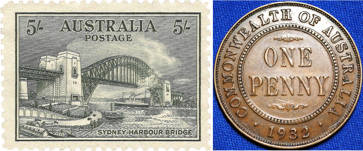 Two images from 1932. On the left, a postage stamp commemorating the opening of the Sydney Harbour Bridge, which was officially opened on March 19, 1932. On the right is an Australian penny made in 1932. Source: Postage stamp from Wikimedia Commons and One penny from TDK Australian Pre-Decimal Coins website