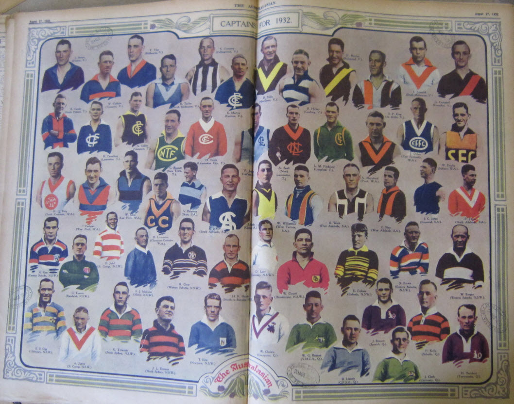 Part of the State Library of Victoria’s newspaper collection is this colour pictorial from The Australasian. It includes images of the captains of all major football clubs competing in the various codes in 1932. South Sydney (bottom row third from left) would win the NSW Rugby League competition, defeating Western Suburbs 19-12. Richmond (top row fourth from right) were the premiers of Victorian Football League (precursor to the Australian Football League) defeating Carlton 13.14 (92) to 12.11 (83) Source: Boyles Football Photos website