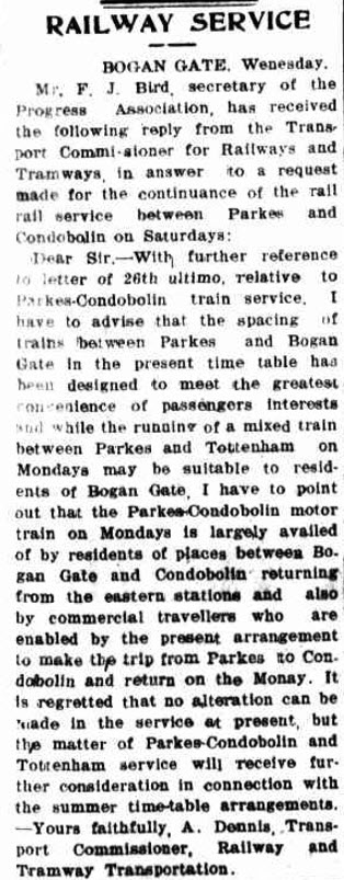 Travel in 1932 was very different to today. Distances seemed further and less people had their own motor vehicles. More people relied on public transport, including the railway. This article highlighted the need for continued railway service especially at Bogan Gate. Source: The Western Champion Thursday June 23, 1932 page 1