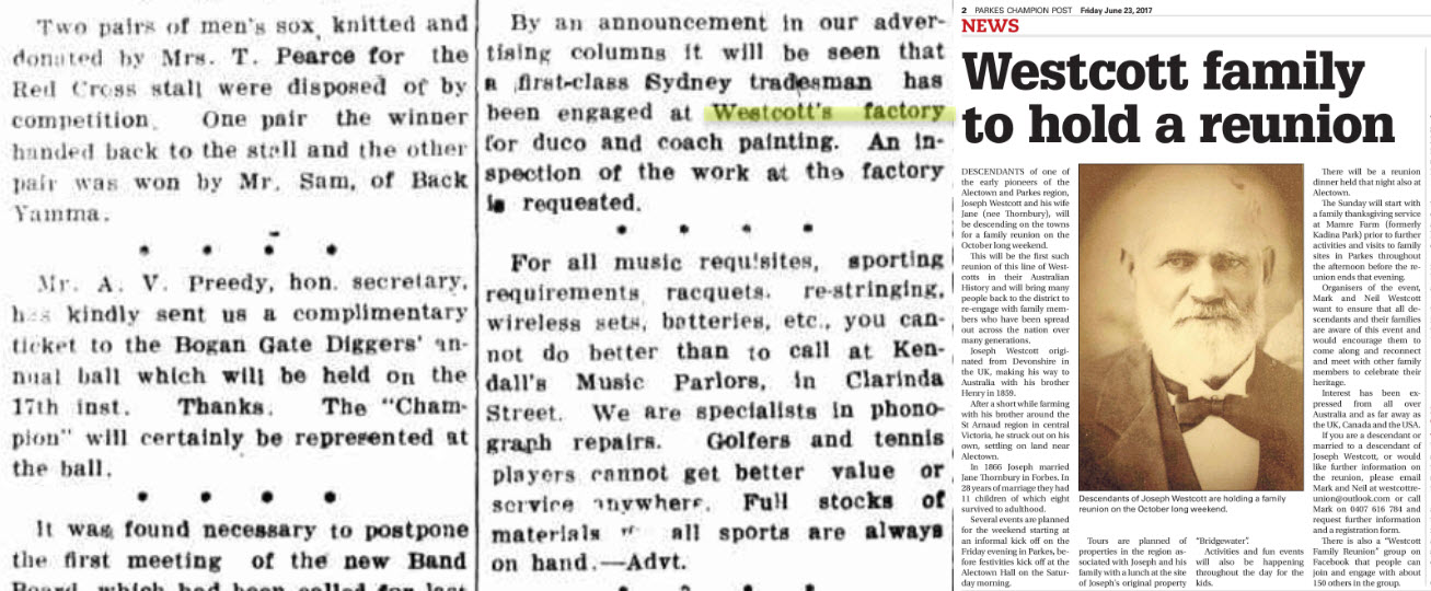 Two newspapers 85 years apart in time, yet both feature articles on the Westcott family. On the left, The Western Champion details the Westcott’s factory recent appointment of a first class Sydney tradesman. On right, information about the upcoming Westcott family reunion in present day newspaper. Source: The Western Champion August 4, 1932 page 6 and Parkes Champion Post Friday June 23, 2017 page 2