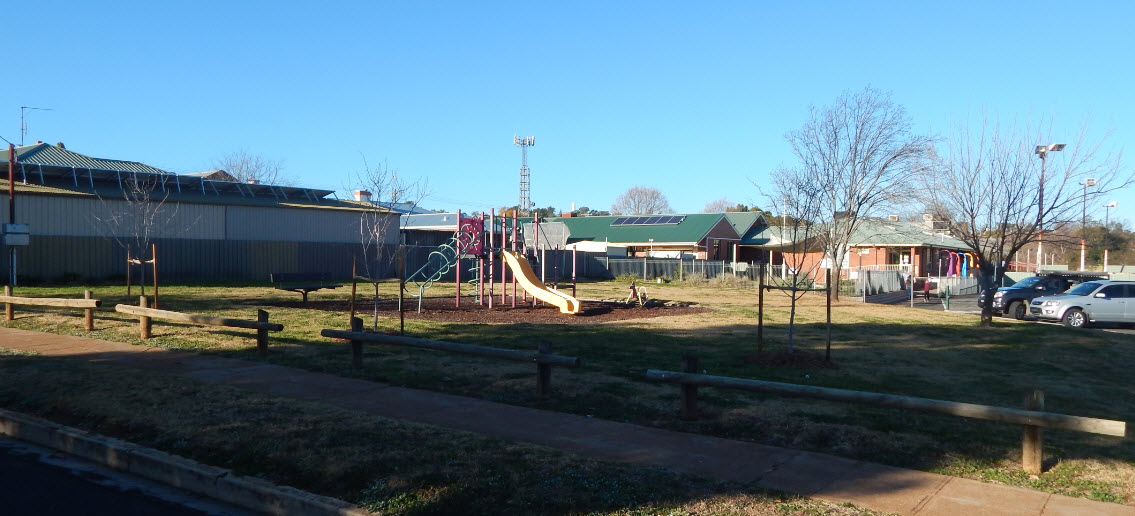 Photograph of AE Fox Park, with photographer on Armstrong Street. The playground equipment is a popular spot for young children and their parents, with Parkes Early Childhood Centre in the background. Photograph by Dan Fredericks (Parkes Shire Library) taken on July 21st, 2017