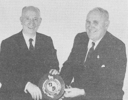 Alfred Fox (left) with Ald. A C Moon, MBE Mayor of Parkes holding the Commemorative Plaque presented to the Coventry City Council, England – the birthplace of Sir Henry Parkes. Source: Honour The Pioneers: 75th Anniversary of the Constitution of the Municipality of Parkes (p2)