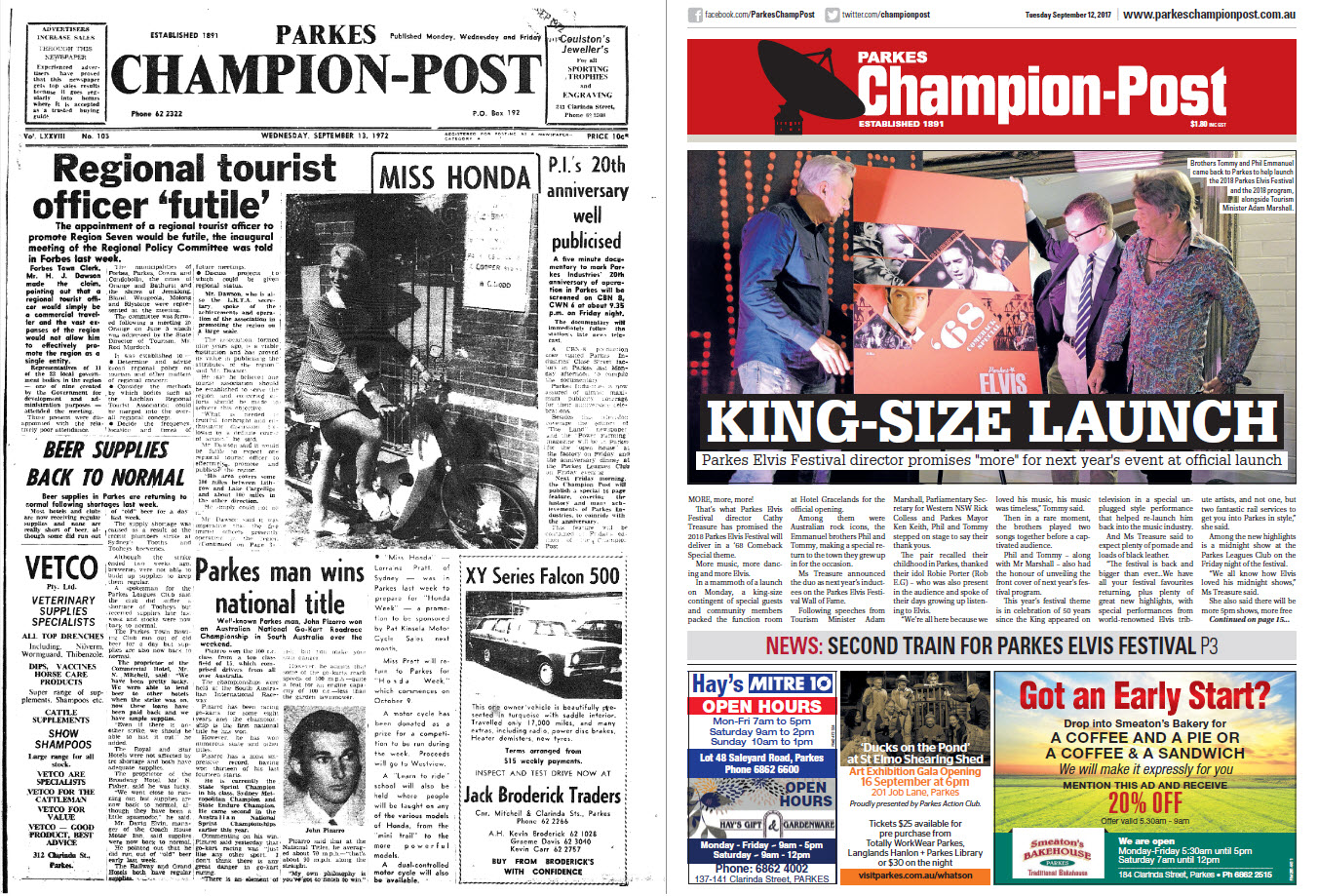 Front page comparison of Parkes Champion Post in 1972 and 2017. In 1972 the main article is regarding the futility of appointing a regional tourist officer, with the region being too large for one person to promote effectively. Also on the front page are reports on beer supplies being replenished and Parkes resident, John Pizarro, being crowned Australian National Go-Kart Roadrace champion. The contemporary front page is in colour and contains only one article – the launch for Parkes Elvis Festival 2018. Source: Parkes Champion Post Wednesday September 13, 1972 and Parkes Champion Post Tuesday September 13, 2017
