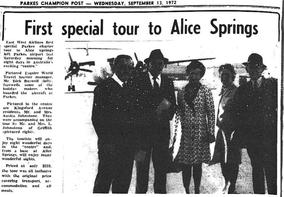 Parkes airport saw a special chartered flight to Alice Springs in spring of 1972 – the first time a plane would fly to Australia’s centre from Parkes! East-West Airlines were the carrier, a regional airline founded in Tamworth and at one time “Australia’s third largest domestic airline” Source: Parkes Champion Post Wednesday September 13, 1972 page 4 and Sydney Morning Herald July 9, 1982 page 6