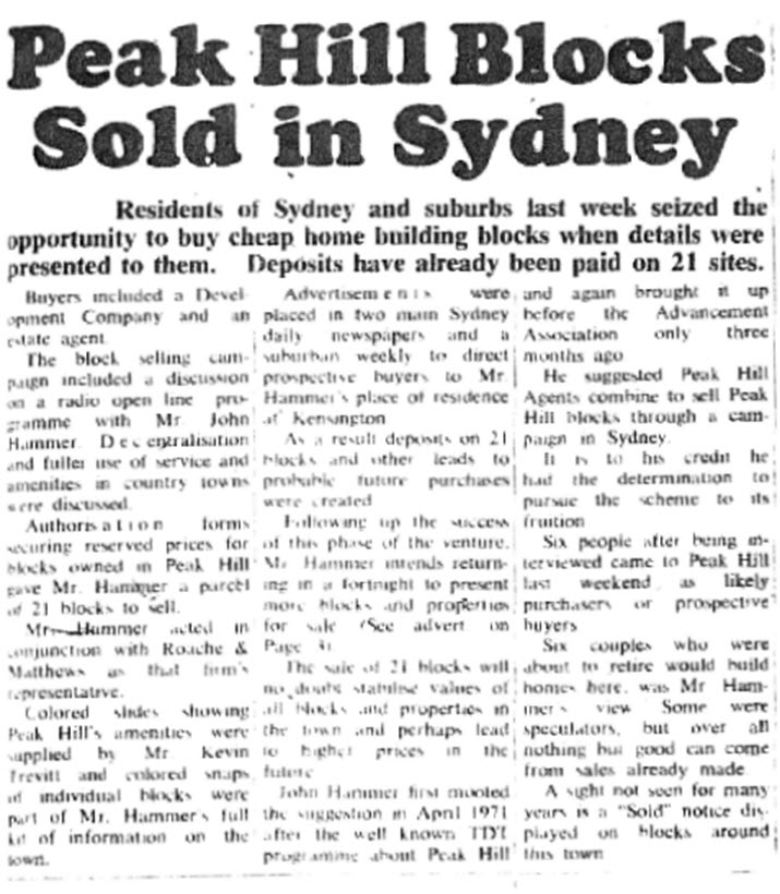 Real estate is still a topic of conversation although this front page report shows that Peak Hill blocks were being sought by Sydney investors. Source: Peak Hill & District Times Wednesday October 11, 1972 page 1