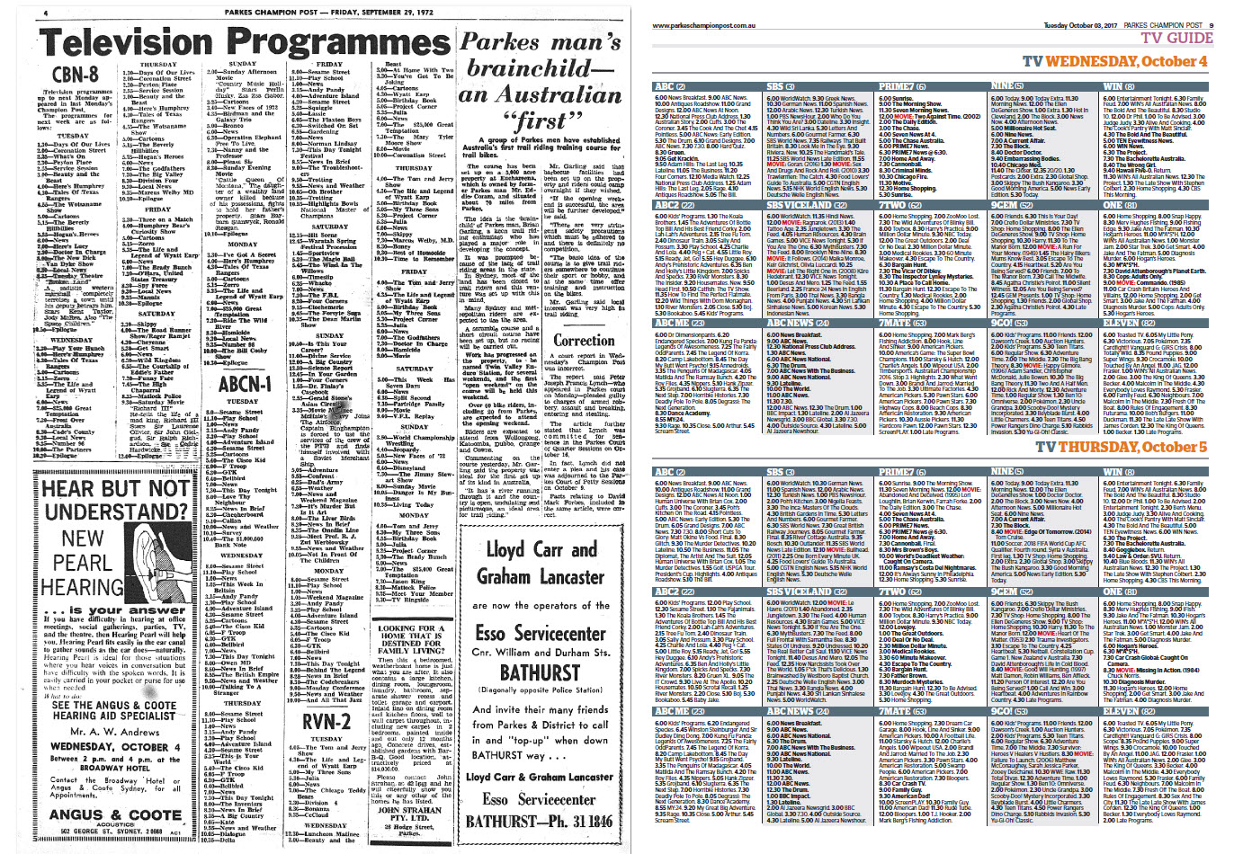 TV Guide 1972 (left) and 2017 (right). Many programs that debuted in the seventies are now on secondary channels. Gone are the “unique” regional channels with rural television networks aligned to the larger metropolitan networks. Source: Parkes Champion Post Friday September 29, 1972 page 4 and Parkes Champion Post Tuesday October 3, 2017 page 9
