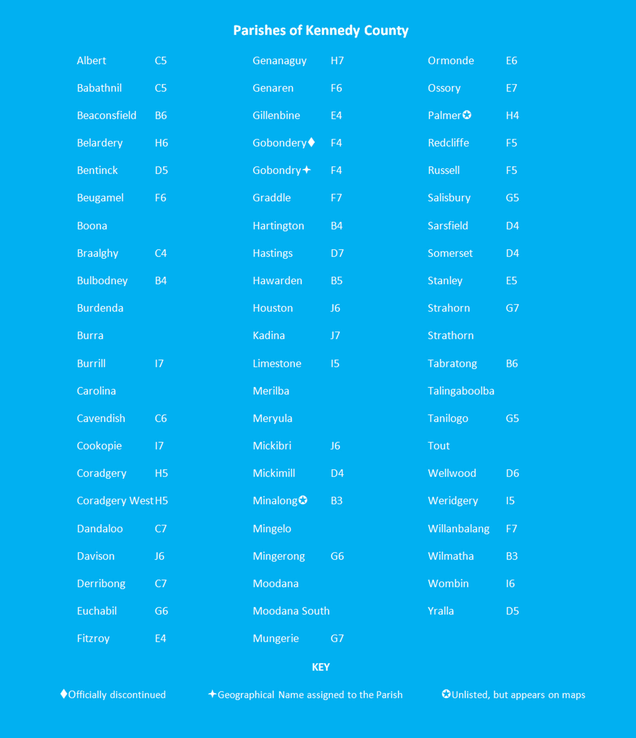 The list of parishes contained in the county of Kennedy are listed below. The map reference relates to the map above (clicking on the images will open them in a new window)