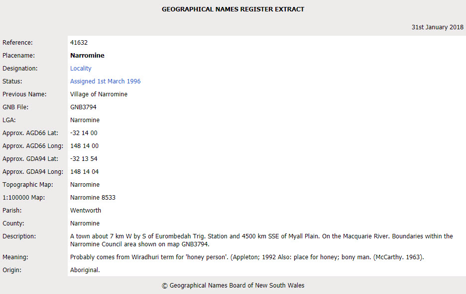 ![Snapshot from the website for Geographical Names Board of New South Wales. While not confirmed, it is believed to be a Wiradhuri [sic] term for "honey person". Source: Geographical Names Board of New South Wales website](https://historyparkes.org/wp-content/uploads/2018/01/gnb-for-narromine.jpg?w=784&h=496)