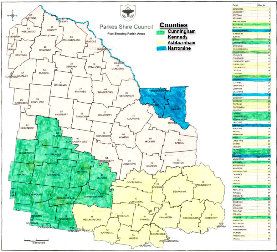 Map of the parish areas of Parkes Shire Council, with the county areas colourised for easier identification. Source: Parkes Shire Council