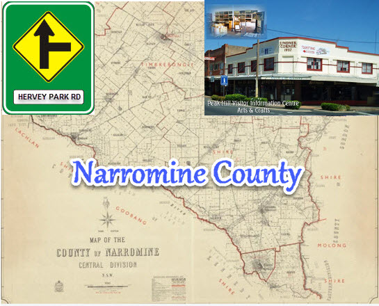 Montage to Narromine County. Background is the map of the county of Narromine. Overlayed are a replica of the road sign to Hervey Park Road, Peak Hill and a photograph Lindner Corner situated on Newell Highway and Mingelo Street, Peak Hill. Images source: Map from Trove; road sign made using images from Roads and Maritime Services and Snagit; and photograph from Parkes NSW website