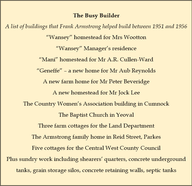 In 1979 Frank had a difficult decision to make. The Armstrong’s eldest grandson, Greg Page, had been employed in the building trade for 19 months without apprenticeship. Greg asked his grandfather to take him on as an apprentice. While overjoyed to not just see his grandson follow in his footsteps but play an active part, Frank had initial concerns. As he writes, “I was nearing 78 years, and it would take three years to see Greg through an apprenticeship.” (p.79) In the end Frank decided to take Greg on, and it ended with Greg passing his Building Trades course, with honours, at Forbes Technical College.