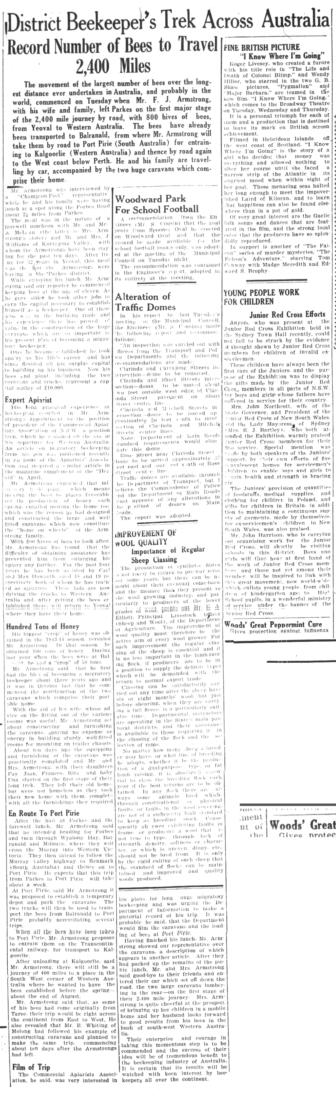 Frank Armstrong undertook many journeys to assist the honey production of his bees. The journey from New South Wales to Western Australia made news – especially as he was transporting 20 million bees along with his family. Source: The Advertiser 1 July, 1947, page 1