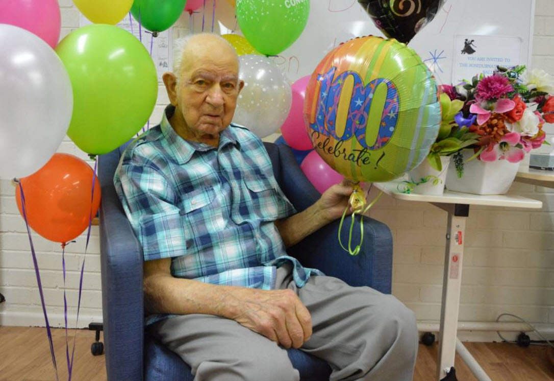 Photograph taken on the occasion of Len Unger’s 100th birthday. Born February 27, 1917 Len has lived his whole life in the Parkes Shire. Starting at the family farm, Rocky Point then Talbot Street, Parkes and then Rosedurnate Aged Care Plus Centre. Source: Speelman, C. (2017, February 27). Century [Photograph found in Len Unger of Alectown turns 100, Parkes Champion Post, Parkes]. Retrieved April 26, 2018, from http://www.parkeschampionpost.com.au/story/4494353/len-was-determined-to-turn-100/ (Originally photographed February 27, 2017)