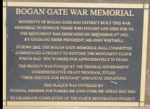 With the centenary of Bogan Gate’s war memorial approaching (three years’ time at time of publishing this blog) the cenotaph has required maintenance work. The latest work in 2016 occurred due to a NSW Government grant Source: https://www.parkeschampionpost.com.au/story/4293444/important-funding-for-bogan-gate/