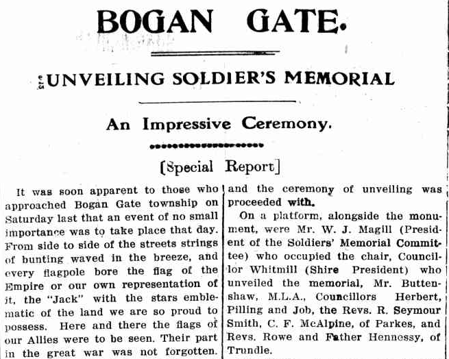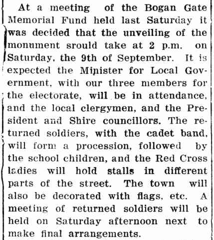 Final plans are made for the unveiling of the Bogan Gate war memorial. Source: Western Champion Thursday 31st August 1922, page 9