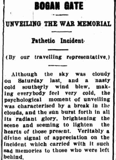 A splendid monument – a Forbes journalist is full of praise for the residents of Bogan Gate. Source: The Forbes Advocate Friday 1st September 1922, page 4