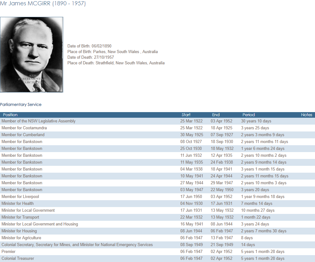 Listing of James McGirr’s parliamentary service. Source: Parliament NSW website
