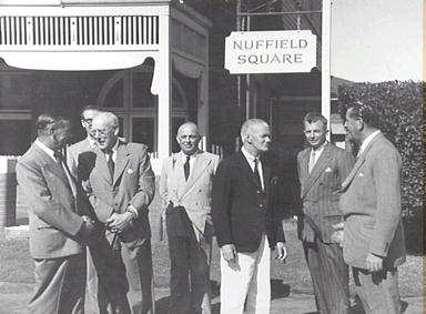 Group of men including Lord Nuffield and Premier James McGirr at Nuffield Square, Sydney factory of British Motor Corporation, Zetland. The address is between Joynton Avenue and South Dowling Street, Zetland. Nuffield Square was on the site of Old Victoria Park Racecourse and was purchased by Lord Nuffield for an assembly plant for Morris Minor and Oxford cars in 1950. Source: City of Sydney Archives