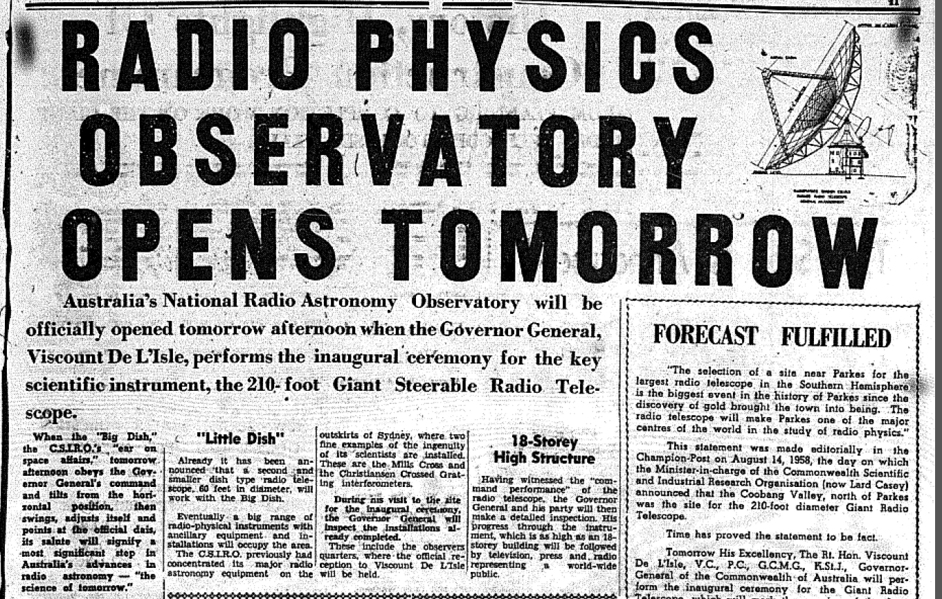 A quote from Dr Bowen’s address at the inauguration of the Parkes Radio Telescope. Source: Parkes Champion Post Thursday November 2, 1961, page 10