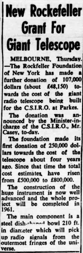 The Carnegie Corporation were not the only Americans to invest money in the building of the Parkes Radio Telescope. This newspaper report states that the Rockefeller Foundation has made a further donation towards the project. Source: The Canberra Times Friday, January 1st 1960, page 4
