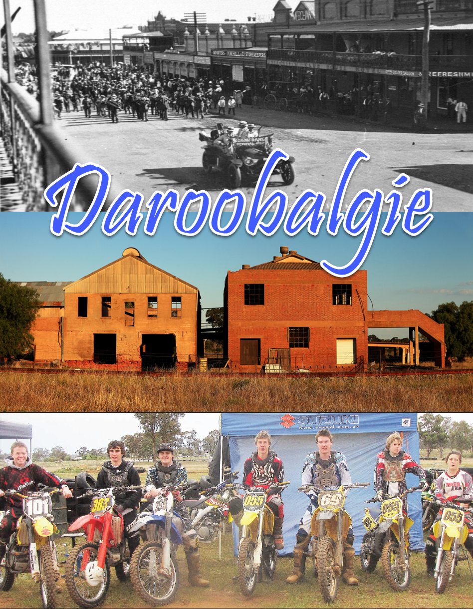 Feature picture of Daroobalgie highlighting past and present. Top: photograph of the Central West Boomerangs, one of many “snowball” marches during the Great War; centre, current photo of the disused Daroobalgie Abbatoir buildings; and bottom, Parkes motocross riders at the Forbes Auto Sports Club at Daroobalgie.