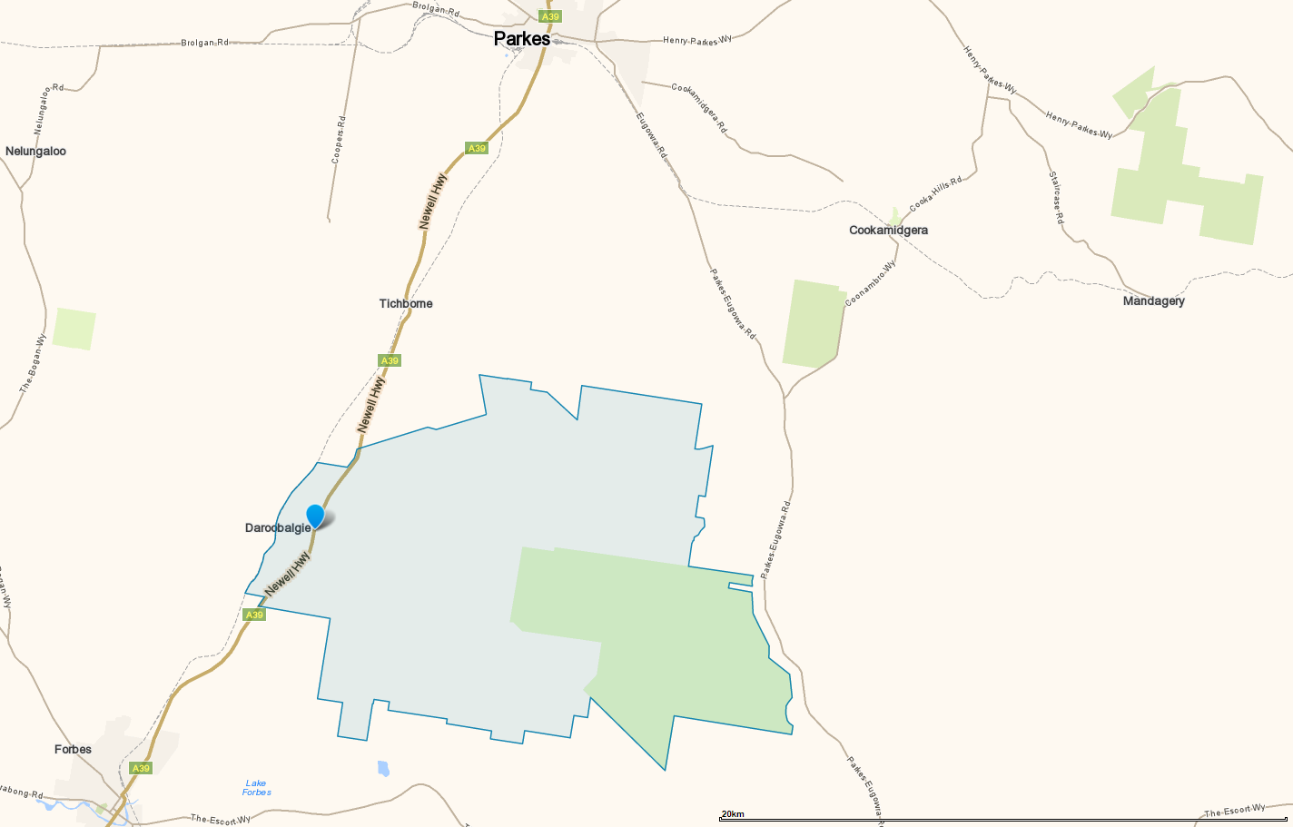 Map of Daroobalgie in relation to Forbes and Parkes. Source: Whereis.com