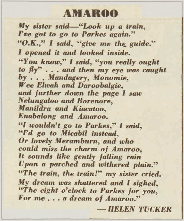 A poem, mentioning several towns and villages of the Parkes district including Daroobalgie. Source: The Australian Women’s Weekly Wednesday November 6, 1963 p.86