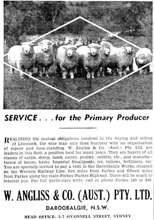 A print advertisement for W. Angliss & Co. Australia based in Daroobalgie. Source: The Farmer and Settler Friday May 20, 1955 p.25