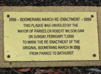 Plaque commemorating the Boomerang March Re-enactment in 1999 from Parkes to Bathurst going via Daroobalgie. Source: Monument Australia website