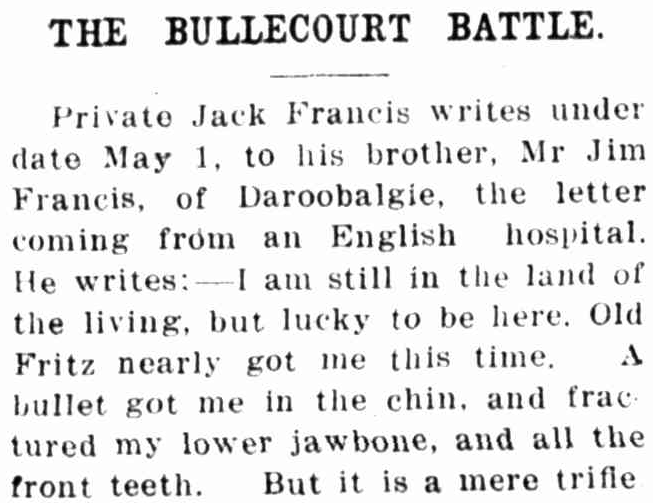 Letter home from France during First World War, to a resident of Daroobalgie. To read the article in its entirety click here. Source: The Forbes Advocate Friday July 27, 1917 p.1