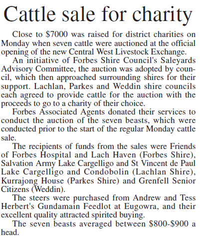 The newly opened Central West Livestock Exchange raises money for local charities. Source: Parkes Champion Post Friday February 24, 2006 p.19