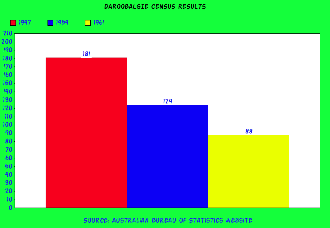 Census results when Daroobalgie was counted on its own. *** Please note the 1947 Census tally is combined from results Daroobalgie (68), near Daroobalgie (50), and Front Daroobalgie (63). Source: Australian Bureau of Statistics website