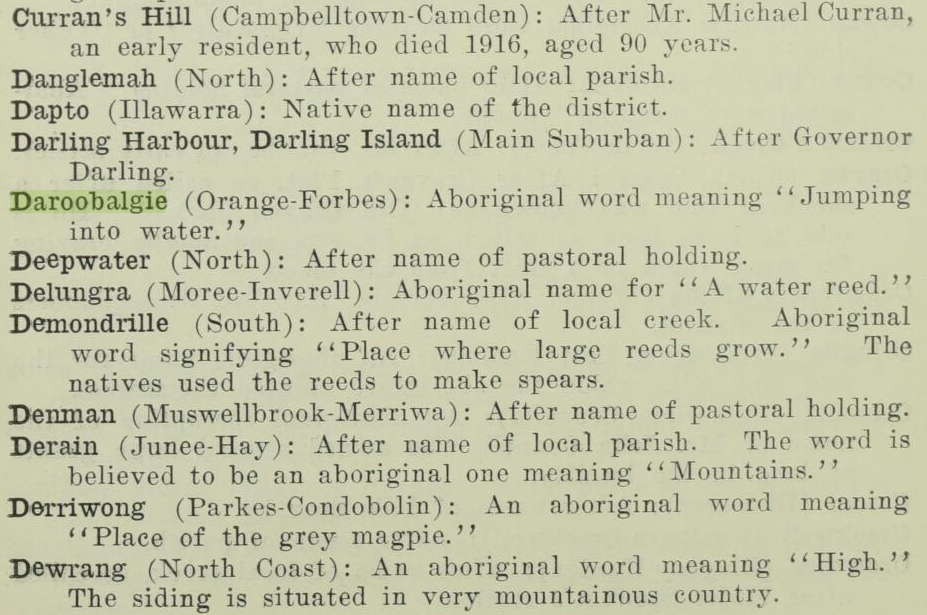 Daroobalgie is first mentioned in The New South Wales Government Gazette in 1848, when a licence to depasture stock at Daroobalgie had been given to Thomas Arkell. (Source: New South Wales Government Gazette (Sydney, NSW : 1832 – 1900), Tuesday February 1, 1848 [Issue No.13] p. 161.) Arkell’s pastoral lease was given in 1839, according to Hildred (1997) p.47. This excellent resource, Forbes, New South Wales, Australia highlights that the definition for Daroobalgie is an Aboriginal word for “jumping into water” (Source: NSWRail.net website) and that like so many place names years ago had an additional way of spelling it DROUBALGIE: