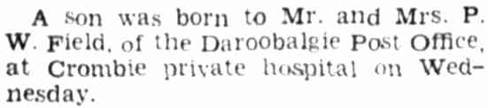 Mr and Mrs Field announce the birth of their son. The Fields looked after Daroobalgie Post Office at the time. Source: The Forbes Advocate Friday June 9, 1944, p.2