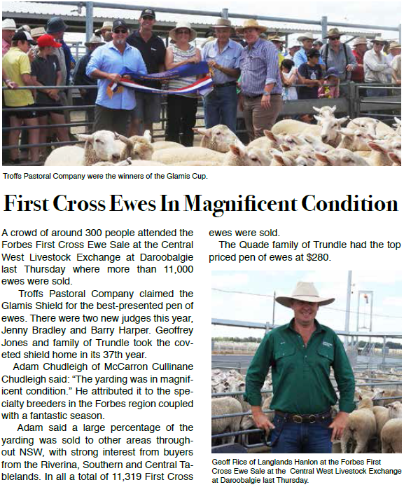A significant event – the Forbes First Cross Ewe Sale at the Central West Livestock Exchange at Daroobalgie, where more than 11,000 ewes were sold. Source: Parkes Phoenix Friday January 13, 2017 p.7
