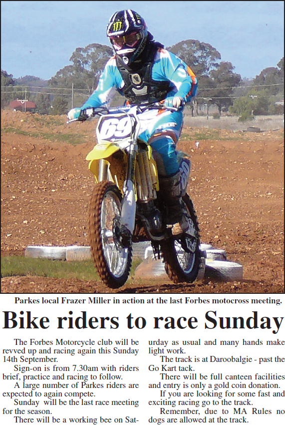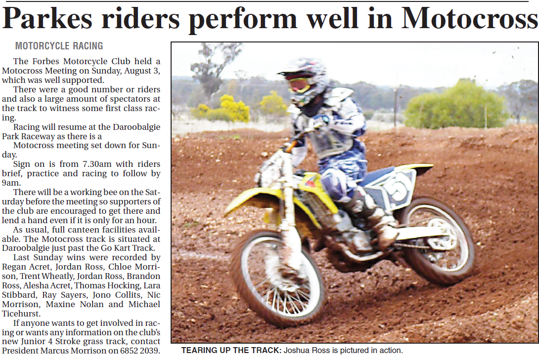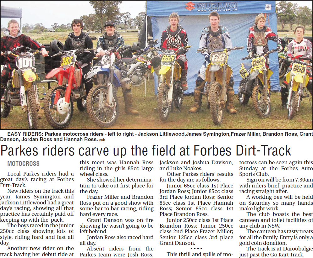 A great day for Parkes motocross riders, with several podium finishes for local riders. Source: Parkes Champion Post Friday, August 7, 2009 p.27
