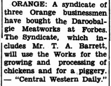 Daroobalgie Meatworks bought by a syndicate of three Orange businessmen. Source: Western Herald Friday September 20, 1968 p.10
