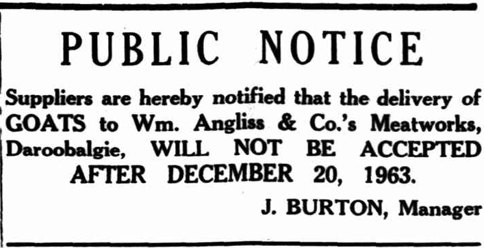 Newspaper public notice informing of delivery dates of goats for Daroobalgie Meatworks. Source: Western Herald Friday December 13, 1963 p.8