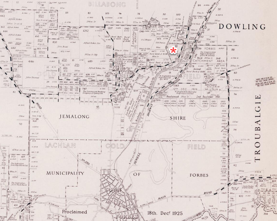 Forbes historian, Max Thomas, explained that the parish of Bocobidgle – in the Ashburnham county – was once the name for Daroobalgie. However the “Droubalgie Run” was established and that name eventually formed into ‘Daroobalgie’ for the village’s name. In its heyday Daroobalgie had a school, post office, a few shops as well as a cricket team.
