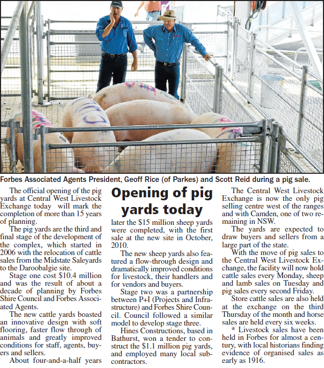 Opening of the new pig yards at Daroobalgie, 15 years in the planning and continuing a tradition that’s nearly a century old. Source: Parkes Champion Post Friday April 20, 2012, p.24
