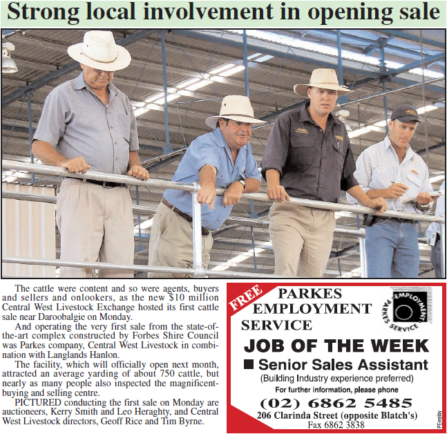 The first sale at the brand new Central West Livestock Exchange, near Daroobalgie. Source: Parkes Champion Post Wednesday January 11, 2006 p.1