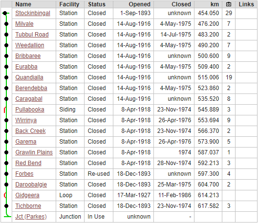 The Stockinbingal-Parkes line highlighting the years of use for Daroobalgie. Source: NSWrail.net website